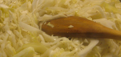 Put in a glass bowl, add a tbsp. of sugar and a teaspoon of kosher salt, 1/2 cup of cider vinegar and 1/2 cup of water. Toss well and let sit for about an hour or so. The cabbage should wilt and release water. Then put the whole bowl, water and all, in a heavy pan and simmer until the liquid boils down a bit. While it simmers add a 1/2 tsp of celery seed.